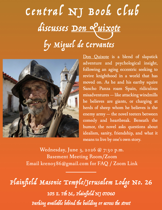 Brothers, please get reading early on Don Quixote by Cervantes - its long but hilarious and worth it. See you there! No cost and is open to everyone. Contact Bro. Kerr Reno kreno586@gmail,com for more info.